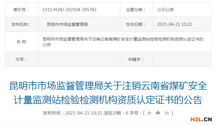 根據(jù)《中華人民共和國行政許可法》第七十條、《檢驗(yàn)檢測機(jī)構(gòu)資質(zhì)認(rèn)定管理辦法》第三十九條規(guī)定,云南省煤礦安全計(jì)量監(jiān)測站申請注銷資質(zhì)認(rèn)定證書,現(xiàn)予以注銷其資質(zhì)認(rèn)定證書(注銷名單見附件),并停止使用標(biāo)志。自公告印發(fā)之日起,被注銷資質(zhì)認(rèn)定證書的檢驗(yàn)檢測機(jī)構(gòu)不得向社會提供和出具具有證明作用的數(shù)據(jù)和結(jié)果。