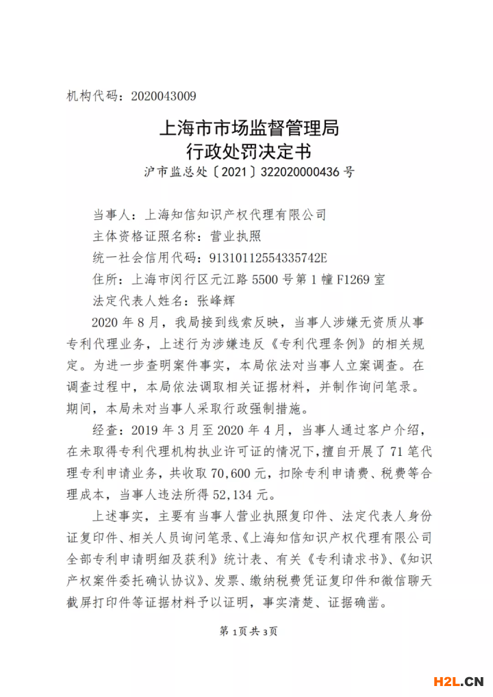 近日,上海市市場監(jiān)督管理局發(fā)布了一則行政處罰信。上海知信知識產(chǎn)權(quán)代理有限公司在未取得專利代理機(jī)構(gòu)執(zhí)業(yè)許可證的情況下,擅自代理專利申請、宣告專利權(quán)無效等相關(guān)業(yè)務(wù),或者以專利代理機(jī)構(gòu)的名義招攬業(yè)務(wù),被沒收違法所得5.2134萬元,罰款5.2134萬元,責(zé)令停止違法行為。