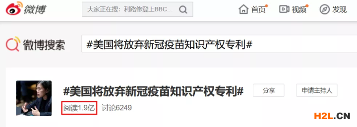 5月6日,#美國(guó)將放棄新冠疫苗知識(shí)產(chǎn)權(quán)專利#這一話題登頂熱搜。截至當(dāng)天15:00.閱讀量已達(dá)1.9億次。