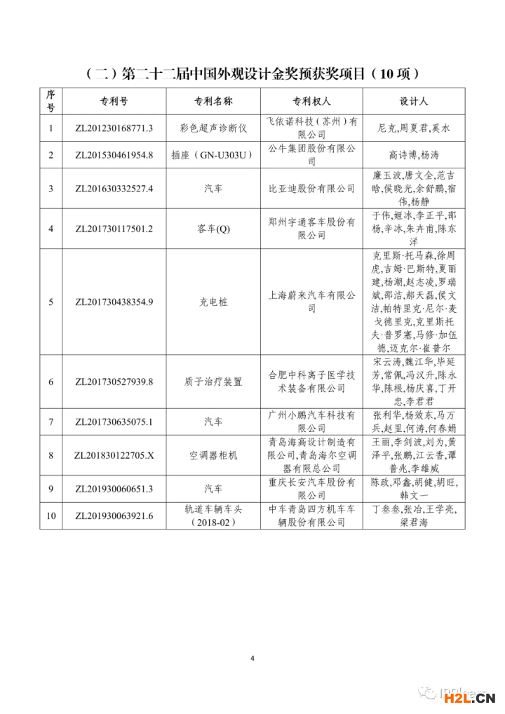 根據(jù)《中國專利獎(jiǎng)評(píng)獎(jiǎng)辦法》《國家知識(shí)產(chǎn)權(quán)局關(guān)于評(píng)選第二十二屆中國專利獎(jiǎng)的通知》規(guī)定,第二十二屆中國專利獎(jiǎng)共評(píng)選出中國專利金獎(jiǎng)?lì)A(yù)獲獎(jiǎng)項(xiàng)目30項(xiàng),中國外觀設(shè)計(jì)金獎(jiǎng)?lì)A(yù)獲獎(jiǎng)項(xiàng)目10項(xiàng),中國專利銀獎(jiǎng)?lì)A(yù)獲獎(jiǎng)項(xiàng)目60項(xiàng),中國外觀設(shè)計(jì)銀獎(jiǎng)?lì)A(yù)獲獎(jiǎng)項(xiàng)目15項(xiàng),中國專利優(yōu)秀獎(jiǎng)?lì)A(yù)獲獎(jiǎng)項(xiàng)目826項(xiàng),中國外觀設(shè)計(jì)優(yōu)秀獎(jiǎng)?lì)A(yù)獲獎(jiǎng)項(xiàng)目56項(xiàng),現(xiàn)予以公示,公示期為2021年5月10日至5月14日。