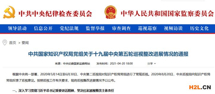 中共國家知識(shí)產(chǎn)權(quán)局黨組關(guān)于十九屆中央第五輪巡視整改進(jìn)展情況的通報(bào)