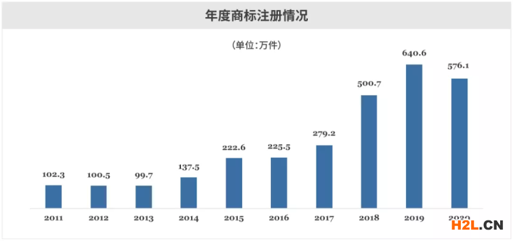 2020年,我國商標(biāo)注冊量為576.1萬件,同比下降10.1%。其中國內(nèi)商標(biāo)注冊557.7萬件,占比96.8%,同比下降9.7%;國外在華商標(biāo)注冊18.4萬件,占比3.2%,同比下降19.3%。2020年,我國商標(biāo)初步審定率為74.1%。