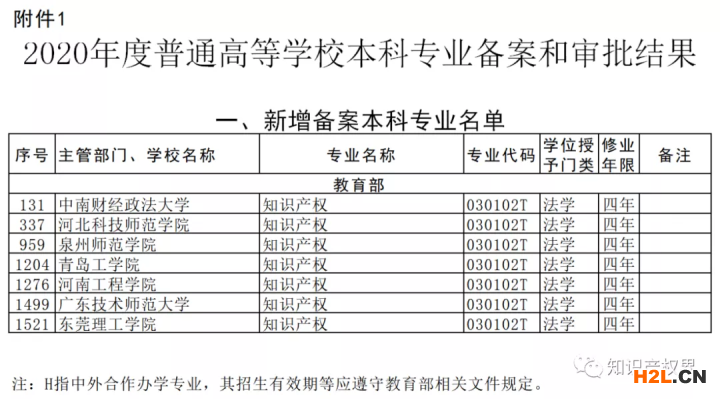 根據(jù)《普通高等學(xué)校本科專業(yè)設(shè)置管理規(guī)定》(教高〔2012〕9號),教育部組織開展了2020年度普通高等學(xué)校本科專業(yè)設(shè)置和調(diào)整工作。經(jīng)申報(bào)、公示、審核等程序,7所高校向教育部申請備案的知識產(chǎn)權(quán)專業(yè)予以備案;知識產(chǎn)權(quán)專業(yè)代碼為 030102T,授予法學(xué)學(xué)士學(xué)位,學(xué)制四年。