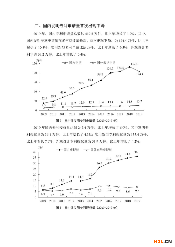 2019 年,我國專利申請量和授權(quán)量增速有所放緩。三類專利中,發(fā)明專利申請量比上年減少 9.2%,占專利申請總量的 32.0%。國內(nèi)發(fā)明專利申請達(dá)到 124.4萬件,比上年減少了 10.8%。國內(nèi)發(fā)明專利授權(quán)量為 36.1 萬件,比上年增長了4.3%。國內(nèi)企業(yè)發(fā)明專利申請量與授權(quán)量分別占國內(nèi)發(fā)明專利申請量與授權(quán)量總數(shù)的 65.0%和 61.6%。我國每萬人口發(fā)明專利擁有量已達(dá) 13.3 件。我國 PCT 國際專利申請量達(dá)到 5.9 萬件,國際排名為第一。2018 年我國三方專利擁有量達(dá)到5323 件,國際排名第 4 位。