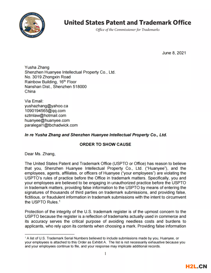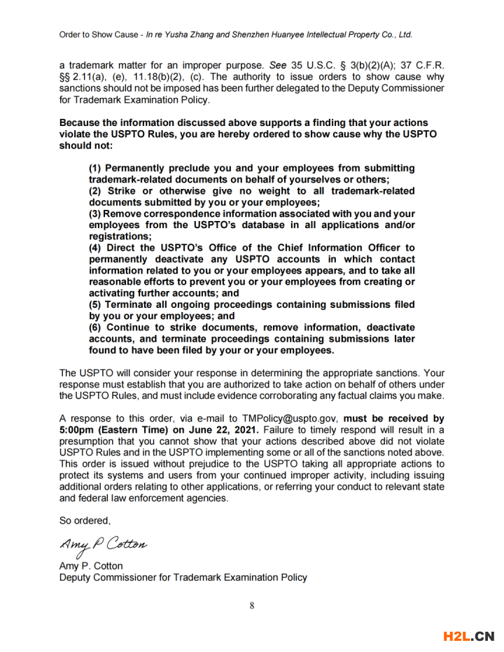 2021年6月8日,美國專利商標局(USPTO)向中國深圳一家知識產(chǎn)權(quán)公司的代表人發(fā)出一份123頁的“ORDER TO SHOW CAUSE”。對該公司代理提交的批量美國商標的行為,尤其是其中涉及到第三方簽名提供虛假、虛構(gòu)和欺詐信息的行為提出質(zhì)疑,要求該公司提出合理的理由,并在美國東部時間6月22日下午5:00前進行回復。否則USPTO將會對該代理機構(gòu)以及代表人進行制裁。