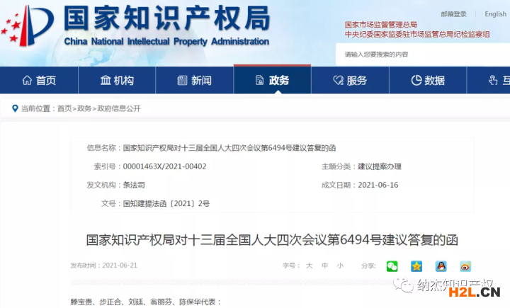 6月21日,國家知識產(chǎn)權(quán)局網(wǎng)站發(fā)布了“國家知識產(chǎn)權(quán)局對十三屆全國人大四次會議第6494號建議答復(fù)的函”。