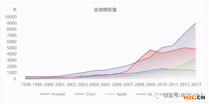 據(jù)《華為創(chuàng)新和知識產(chǎn)權(quán)白皮書》顯示,從 2004 年開始,華為公司全球?qū)@跈?quán)量達(dá)到同行業(yè)領(lǐng)先的美國公司同等規(guī)模。下圖為華為公司及部分同行業(yè)公司在 1998-2013 年獲得全球?qū)@跈?quán)數(shù)量統(tǒng)計(jì)圖。