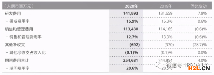 據(jù)華為2020年年度報(bào)告顯示,華為在2020年的研發(fā)投入為141.893百萬,研發(fā)費(fèi)用率為15.9%,比2019年增加了0.6%。