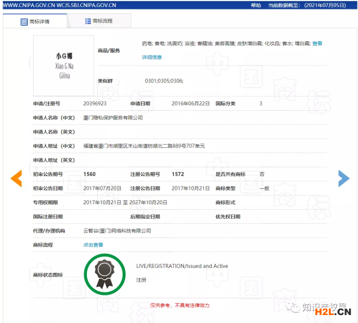 其中除了第20397363號“小G娜 GIIINA”正在等待實質(zhì)審查,另外兩個“小G娜 XIAO G NA GIIINA”商標(biāo)均已成功注冊。