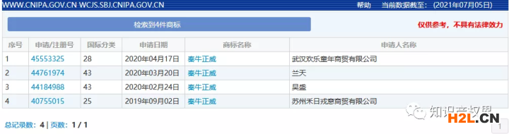 2019年8月17日,秦牛正威因與吳亦凡牽手被拍后曝光。同年9月2日,蘇州禾日戎意商貿(mào)有限公司申請(qǐng)了第40755015號(hào)“秦牛正威”商標(biāo),該商標(biāo)申請(qǐng)類(lèi)別為第25類(lèi),用于褲子,成品衣,外套等商品,目前已成功注冊(cè)。2020年相繼又有其他企業(yè)或個(gè)人申請(qǐng)了3件“秦牛正威”商標(biāo),目前除第44761974號(hào)“秦牛正威”商標(biāo)正在等待實(shí)質(zhì)審查,另外兩個(gè)均被駁回。