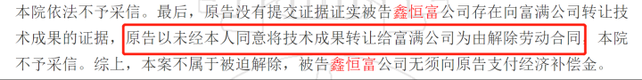 2014年10月,黃洪偉等16名原告與鑫恒富解除勞動(dòng)合同,并主張其未經(jīng)本人同意將技術(shù)轉(zhuǎn)讓給富滿電子,但并未提交證據(jù)證實(shí),法院不予采信。