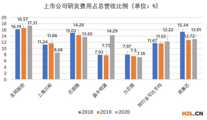 超高速成長(zhǎng)背后,英集芯的研發(fā)投入也處于行業(yè)較高水平。2018至2020年,英集芯研發(fā)投入分別為3322.75萬(wàn)元、4426.05萬(wàn)元、5063萬(wàn)元,占總營(yíng)收比例分別為15.34%、12.72%、13.01%。