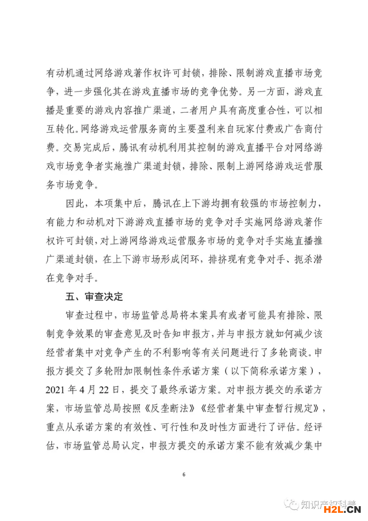 審查表明,本案相關(guān)市場為中國境內(nèi)網(wǎng)絡(luò)游戲運(yùn)營服務(wù)市場和游戲直播市場。騰訊在上游網(wǎng)絡(luò)游戲運(yùn)營服務(wù)市場份額超過40%,排名第一;虎牙和斗魚在下游游戲直播市場份額分別超過40%和30%,排名第一、第二,合計(jì)超過70%。目前,騰訊已具有對虎牙的單獨(dú)控制權(quán)和對斗魚的共同控制權(quán)。如虎牙與斗魚合并,將使騰訊單獨(dú)控制合并后實(shí)體,進(jìn)一步強(qiáng)化騰訊在游戲直播市場的支配地位,同時(shí)使騰訊有能力和動(dòng)機(jī)在上下游市場實(shí)施閉環(huán)管理和雙向縱向封鎖,具有或者可能具有排除、限制競爭效果,不利于市場公平競爭、可能減損消費(fèi)者利益,也不利于網(wǎng)絡(luò)游戲和游戲直播市場規(guī)范健康持續(xù)發(fā)展。經(jīng)評估,騰訊提出的附加限制性條件承諾方案不能有效解決前述競爭關(guān)注。