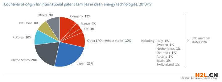 從主要的地區(qū)創(chuàng)新趨勢來看,自2000年以來,歐洲企業(yè)和研究機(jī)構(gòu)在低碳能源發(fā)明專利方面一直處于領(lǐng)先地位。在過去十年(2010-2019年)中,這些技術(shù)的所有國際專利族中,歐洲申請(qǐng)人占28%(僅德國就占12%),其次是日本(25%)、美國(20%)、韓國(10%)和中國 (8%)。