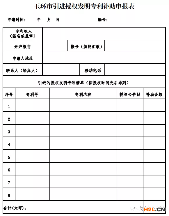 附件1.玉環(huán)市引進授權(quán)發(fā)明專利補助申報表