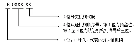 (一)內(nèi)資認(rèn)證機(jī)構(gòu):第1位為R,第2位至第5位為認(rèn)證機(jī)構(gòu)順序號(hào),第2位為預(yù)留擴(kuò)展位,默認(rèn)為0;第3位至第5位為認(rèn)證機(jī)構(gòu)批準(zhǔn)號(hào)后三位。第6位至第7位為分支機(jī)構(gòu)代碼,由認(rèn)證機(jī)構(gòu)自行編碼。
