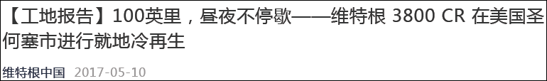 瀏覽檢索結(jié)果,發(fā)現(xiàn)路面機械網(wǎng)中的新聞資訊信息模塊中提及了維特根3800CR就地冷再生機在國內(nèi)首次成功應(yīng)用,具體如下:
