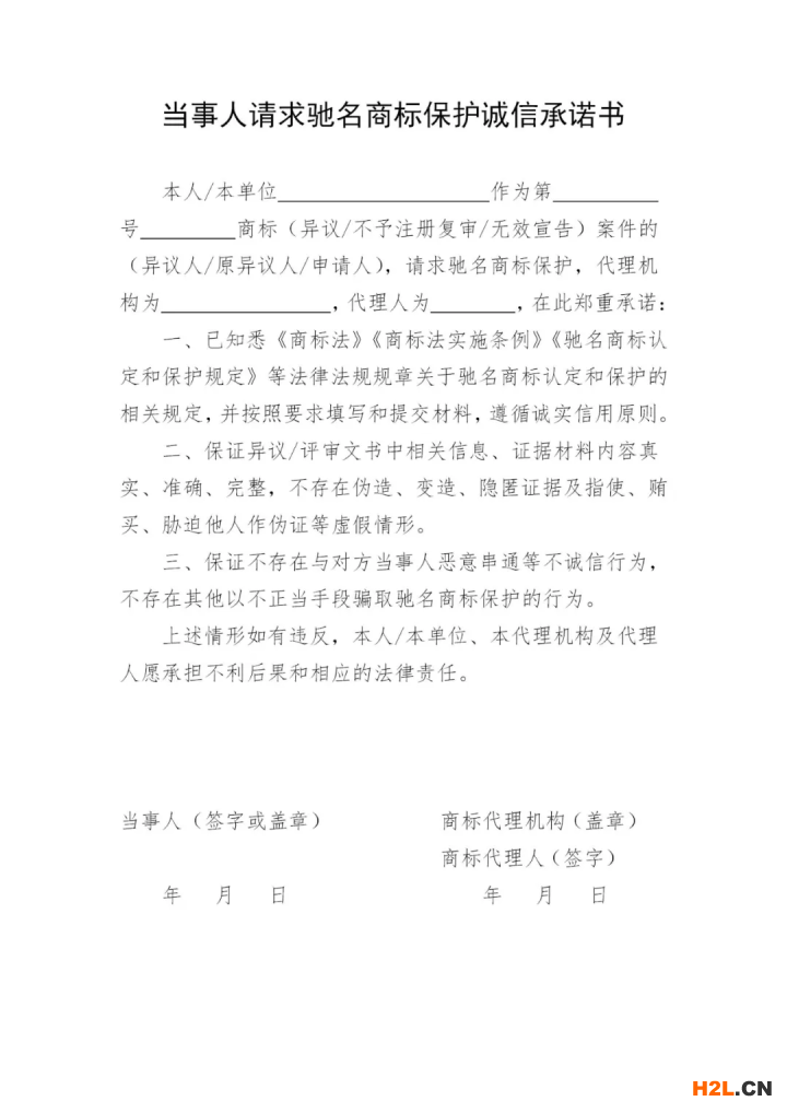 為嚴(yán)格規(guī)范當(dāng)事人請(qǐng)求馳名商標(biāo)保護(hù)時(shí)提交文書、證據(jù)的相關(guān)行為,營(yíng)造誠(chéng)實(shí)守信的良好氛圍,自2021年9月1日起,在異議、評(píng)審案件中請(qǐng)求馳名商標(biāo)保護(hù)的當(dāng)事人提交申請(qǐng)書時(shí),需一并提交本人/本單位及其商標(biāo)代理機(jī)構(gòu)、代理人簽章的《當(dāng)事人請(qǐng)求馳名商標(biāo)保護(hù)誠(chéng)信承諾書》。