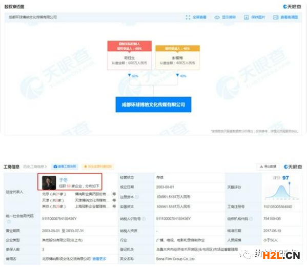 據(jù)天眼查顯示,成都環(huán)球博納文化傳媒有限公司法定代表人為彭愛梅,大股東、實(shí)控人以及最終受益人均為茍某生。博納影業(yè)集團(tuán)有限公司法定代表人、大股東、最終受益人則為于某。從這兩公司的股權(quán)穿透圖來看,并無聯(lián)系。