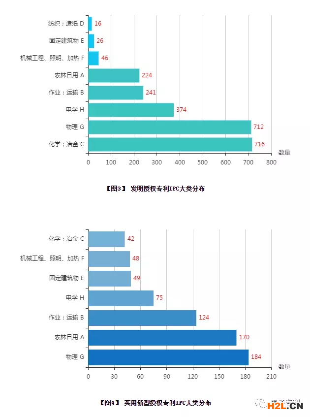 分布如【圖5】所示,主要集中在 G(物理)、C(化學(xué);冶金)、B(作業(yè);運輸)、H(電學(xué)),實用新型授權(quán)專利IPC大類分布如【圖6】所示,主要集中在 A(農(nóng)林日用)、B(作業(yè);運輸)、G(物理);發(fā)明、實用新型授權(quán)專利IPC小類如表【表3】、【表4】所示。