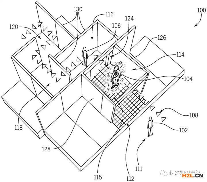 該專利涉及特殊效果可視化系統(tǒng),其包括圖像捕獲和環(huán)境顯示或投射系統(tǒng)。特殊效果可視化系統(tǒng)可以在使用者沿著路徑行走通過環(huán)境(其既給該觀看者提供傳輸幻象又給在范圍內(nèi)的任何觀看者提供傳輸幻象)時(shí)觸發(fā)一個(gè)或更多類型的環(huán)境效果(例如,嗅覺、熱、風(fēng)、冷、觸覺或聽覺);環(huán)境效果可以為使用者提供與傳輸幻象的特別的特點(diǎn)(例如,消失到煙或火焰中、分散成顆?;蛐凶叩较x洞中)關(guān)聯(lián)的各種感官刺激。以此給游客提供沉浸式和/或變換式體驗(yàn)。