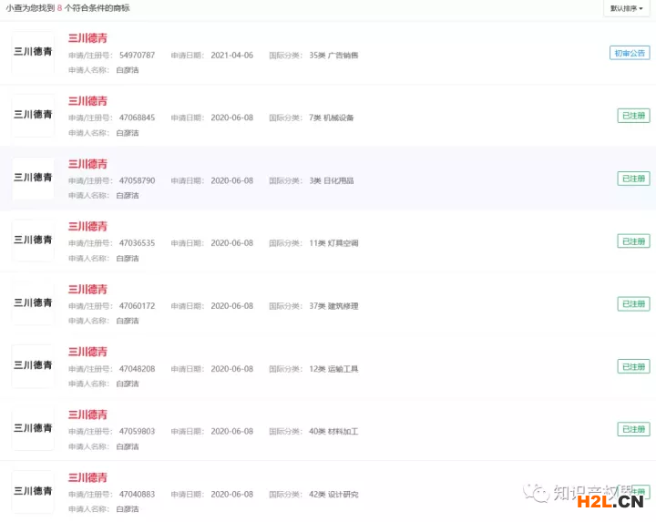 該申請人也分別于2020年6月8日和2021年4月6日申請了8件“三川德青”的商標,目前均注冊成功。