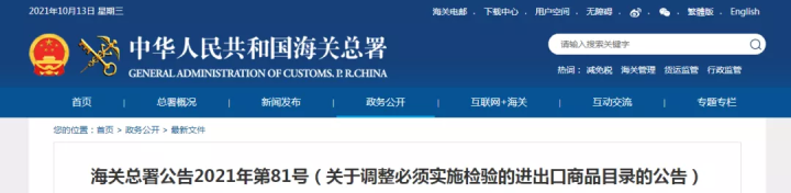 海關(guān)總署公告2021年第81號(hào)(關(guān)于調(diào)整必須實(shí)施檢驗(yàn)的進(jìn)出口商品目錄的公告)