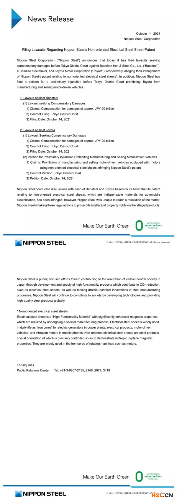 對于此次不僅起訴制造電磁鋼板的寶山鋼鐵,還起訴豐田汽車的理由,日本制鐵表示“采用侵犯專利權(quán)的電磁鋼板、銷售電動(dòng)汽車,侵犯了本公司的專利權(quán)”。這是日本制鐵首次起訴汽車廠商。