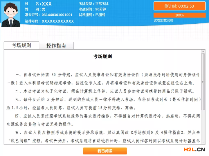 五、應(yīng)試人員應(yīng)按照考試系統(tǒng)的提示登錄系統(tǒng),須認(rèn)真閱讀《考場(chǎng)規(guī)則》及《操作指南》,并點(diǎn)擊“我已閱讀”按鈕??荚囬_(kāi)始后,考試系統(tǒng)將自動(dòng)進(jìn)行計(jì)時(shí),應(yīng)試人員作答時(shí)間以考試系統(tǒng)計(jì)時(shí)器顯示的結(jié)果為準(zhǔn)。