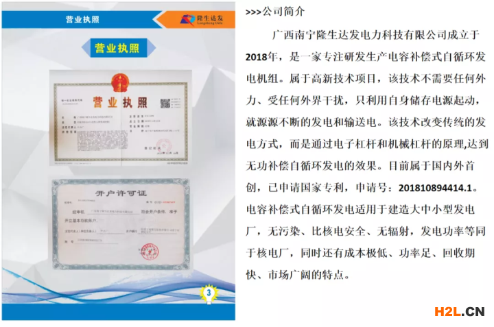近日,網(wǎng)爆廣西南寧隆生達(dá)發(fā)電力科技有限公司官網(wǎng)聲稱其研發(fā)的發(fā)電機組“突破了能量守恒定律,不需要任何原材料,不受任何外界干擾,已獲得國家專利”,通過電子杠桿和機械杠桿的原理,成功實現(xiàn)了無功補償自循環(huán)發(fā)電的效果。