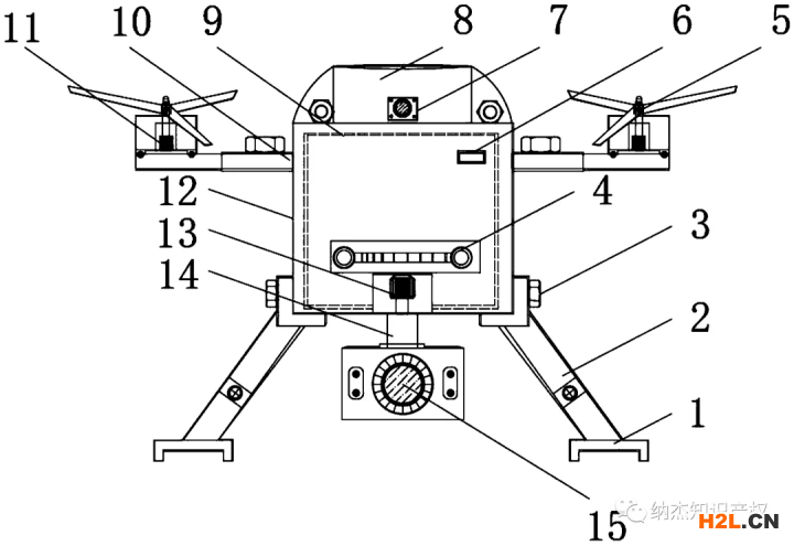 該智能定位偵查火情的消防無(wú)人機(jī)設(shè)置有攝像機(jī)、第二電機(jī)與轉(zhuǎn)軸,攝像機(jī)安裝在機(jī)體的下端,是為了方便對(duì)前方的景象進(jìn)行無(wú)遮擋的觀(guān)察,而且通過(guò)第二電機(jī)的作用帶動(dòng)轉(zhuǎn)軸進(jìn)行轉(zhuǎn)動(dòng),可以讓攝像機(jī)進(jìn)行旋轉(zhuǎn)一周,不僅使觀(guān)察的范圍擴(kuò)大,還大大加強(qiáng)了偵查的效果,并起到了定位的作用。