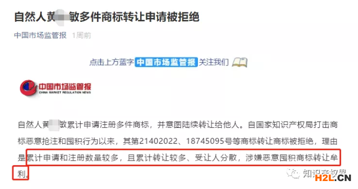 核心提示:近日,中國市場監(jiān)管報發(fā)布了一則自然人商標轉(zhuǎn)讓申請被拒絕的新聞。報道中提到,自然人黃某敏累計申請注冊多件商標,并意圖陸續(xù)轉(zhuǎn)讓給他人。