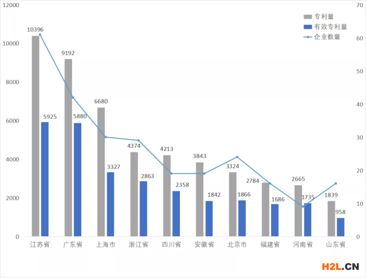 從省市分布上來(lái)看,小巨人上市企業(yè)多集中于經(jīng)濟(jì)發(fā)達(dá)地區(qū)。省市專利總量排名前十名中,中東部占據(jù)了7名,尤其以江蘇、廣東、上海最多,專利總量分別為10396件、9192件、6680件。