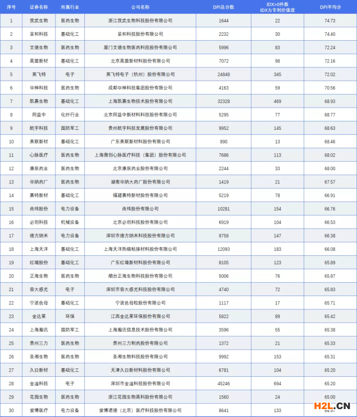 圖5:小巨人上市企業(yè)DPI專利價(jià)值平均分65分以上榜單