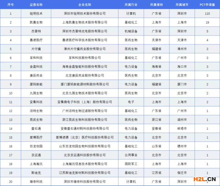 300余家小巨人上市企業(yè)中,僅有20家進(jìn)行了PCT海外布局,其中尤其以深圳市銳明技術(shù)股份有限公司較為突出,PCT申請(qǐng)量達(dá)110件,位于第二名的凱賽生物PCT的申請(qǐng)量降至19件,其余企業(yè)PCT申請(qǐng)量?jī)H為個(gè)位數(shù),在PCT海外布局方面有待進(jìn)一步加強(qiáng)。