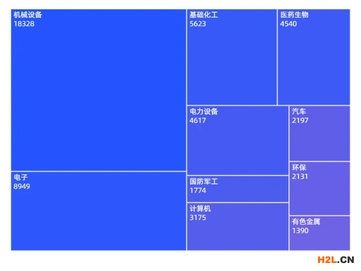 專利總量上來(lái)看,機(jī)械設(shè)備行業(yè)占據(jù)較為明顯的優(yōu)勢(shì)地位,擁有18328件專利,其中有效專利10554件;電子行業(yè)專利總量8949件,有效專利量為5148件。