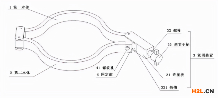 1.一種卡箍,包括第一本體(1),第二本體(2)和緊固裝置(3),所述緊固裝置(3)包括螺栓(32),其特征在于,所述第一本體(1)的一端與第二本體(2)的一端鉸接,第一本體(1)的另一端與第二本體(2)的另一端通過螺栓(32)連接。