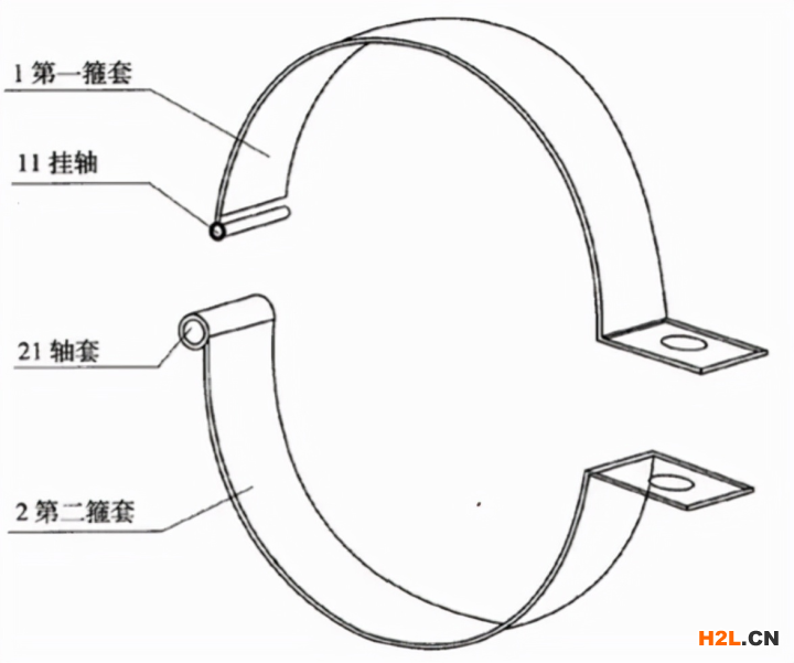 一種管道連接卡箍,包括:第一箍套1和第二箍套2.第一箍套1和第二箍套2均呈半圓形,在第一箍套1和第二箍套2的兩側(cè)設(shè)有連接機構(gòu),連接機構(gòu)分為預(yù)連接端和固定連接端。預(yù)連接端是在第一箍套上設(shè)置掛軸11.在第二箍套的對應(yīng)端設(shè)置與掛軸11對應(yīng)的軸套21;固定連接端是在第一箍套1和第二箍套2的各自的另一端設(shè)置連接耳,連接耳上設(shè)有供連接螺栓穿過的通孔。