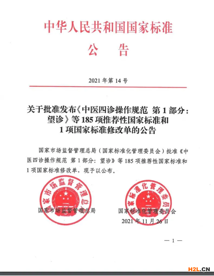 近日,國(guó)家市場(chǎng)監(jiān)督管理總局(國(guó)家標(biāo)準(zhǔn)化管理委員會(huì))批準(zhǔn)發(fā)布《中醫(yī)四診操作規(guī)范第1部分:望診》等185項(xiàng)推薦性國(guó)家標(biāo)準(zhǔn)和1項(xiàng)國(guó)家標(biāo)準(zhǔn)修改單。具體內(nèi)容如下: