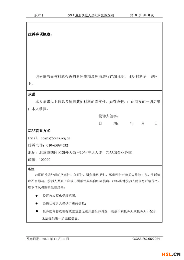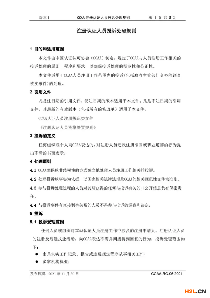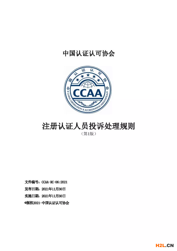 為優(yōu)化注冊認證人員投訴工作流程,提升工作質(zhì)量,中國認證認可協(xié)會(CCAA)針對注冊認證人員的投訴工作制定了《注冊認證人員投訴處理規(guī)則》,并于2021年11月24日經(jīng)中國認證認可協(xié)會審議通過,現(xiàn)予發(fā)布,自發(fā)布之日起實施,《人員注冊申訴、投訴與爭議處理程序規(guī)則》同時廢止。