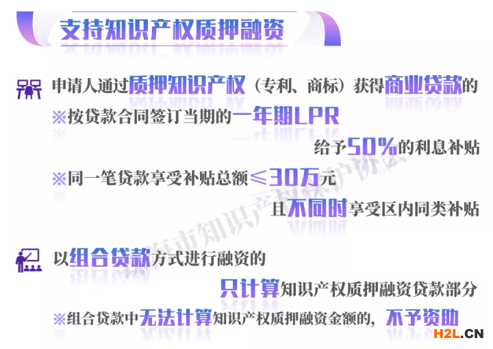 (九)支持知識(shí)產(chǎn)權(quán)質(zhì)押融資。對(duì)申請(qǐng)人通過(guò)質(zhì)押知識(shí)產(chǎn)權(quán)(專(zhuān)利、商標(biāo))獲得商業(yè)銀行貸款的,按貸款合同簽訂當(dāng)期的一年期貸款市場(chǎng)報(bào)價(jià)利率(LPR)給予50%的利息補(bǔ)貼,同一筆貸款享受補(bǔ)貼總額不超過(guò)30萬(wàn)元且不同時(shí)享受區(qū)內(nèi)同類(lèi)補(bǔ)貼。以組合貸款方式進(jìn)行融資的,只計(jì)算知識(shí)產(chǎn)權(quán)質(zhì)押融資貸款部分,組合貸款中無(wú)法計(jì)算知識(shí)產(chǎn)權(quán)質(zhì)押融資金額的,不予資助。