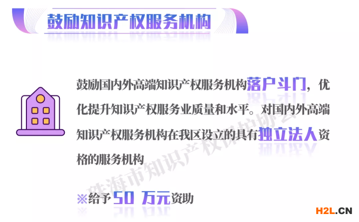 (十一)鼓勵(lì)國(guó)內(nèi)外高端知識(shí)產(chǎn)權(quán)服務(wù)機(jī)構(gòu)落戶(hù)斗門(mén),優(yōu)化提升知識(shí)產(chǎn)權(quán)服務(wù)業(yè)質(zhì)量和水平。對(duì)國(guó)內(nèi)外高端知識(shí)產(chǎn)權(quán)服務(wù)機(jī)構(gòu)在我區(qū)設(shè)立的具有獨(dú)立法人資格的服務(wù)機(jī)構(gòu),給予50萬(wàn)元資助。