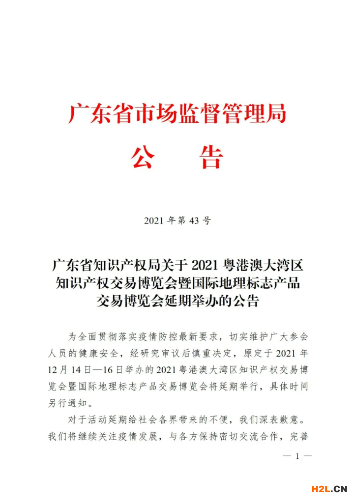 原標(biāo)題:廣東省知識(shí)產(chǎn)權(quán)局關(guān)于2021粵港澳大灣區(qū)知識(shí)產(chǎn)權(quán)交易博覽會(huì)暨國際地理標(biāo)志產(chǎn)品交易博覽會(huì)延期舉辦的公告