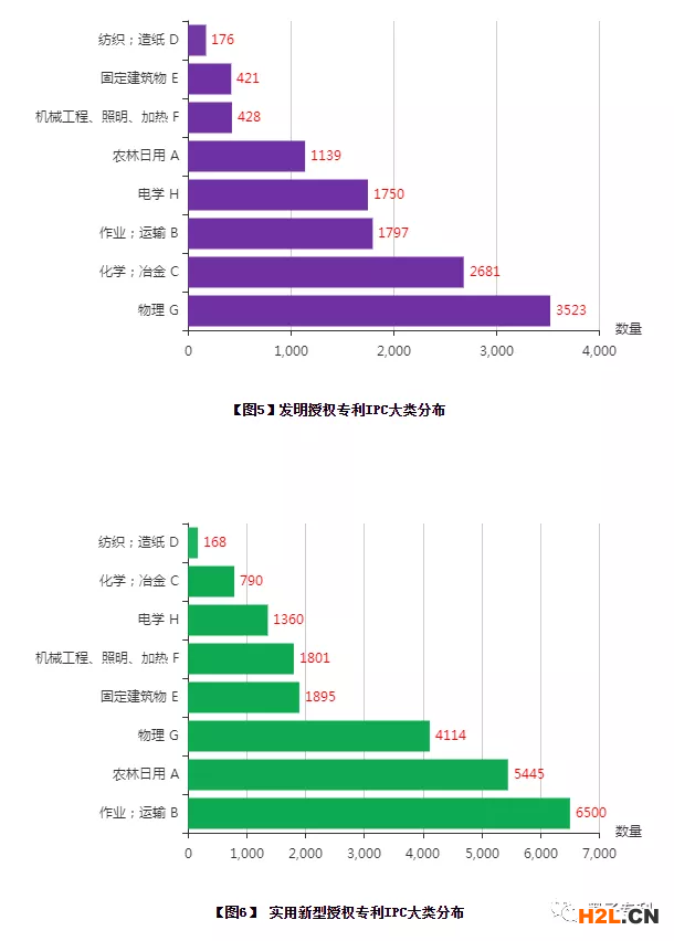 2021年11月高校發(fā)明授權(quán)專(zhuān)利IPC大類(lèi)分布如【圖5】所示,主要集中在 G(物理)、C(化學(xué);冶金)、B(作業(yè);運(yùn)輸)、H(電學(xué)),實(shí)用新型授權(quán)專(zhuān)利IPC大類(lèi)分布如【圖6】所示,主要集中在 B(作業(yè);運(yùn)輸)、A(農(nóng)林日用)、G(物理);發(fā)明、實(shí)用新型授權(quán)專(zhuān)利IPC小類(lèi)如表【表3】、【表4】所示。