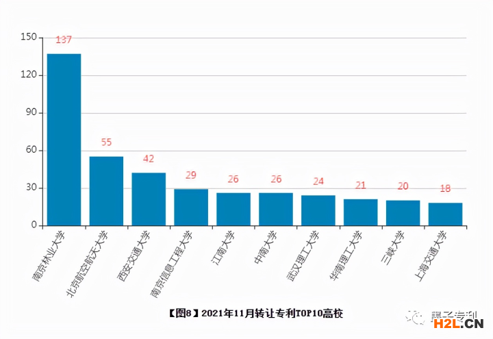 2021年11月全國(guó)高校專(zhuān)利轉(zhuǎn)讓分布如【圖7】,江蘇省以 378 件專(zhuān)利發(fā)生轉(zhuǎn)讓位居第一、浙江省 161件、北京 140件;轉(zhuǎn)讓專(zhuān)利TOP10的高校如【圖8】,其中南京林業(yè)大學(xué)轉(zhuǎn)讓137件專(zhuān)利位居第一、北京航空航天大學(xué)轉(zhuǎn)讓 55件專(zhuān)利位居第二,其次是西安交通大學(xué)轉(zhuǎn)讓 42件專(zhuān)利;科研院所專(zhuān)利轉(zhuǎn)讓TOP10如【圖9】,其中, 中國(guó)電子科技集團(tuán)公司第十八研究所,中國(guó)科學(xué)院蘭州化學(xué)物理研究所獲得 32件和 29 件,分別排名第一、第二。