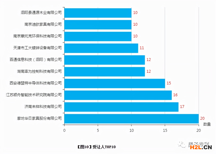 受讓人TOP10如【圖10】所示,其中,廊坊華日家具股份有限公司獲得 20 件專(zhuān)利,濟(jì)南未樣科技有限公司獲得 17 件專(zhuān)利,江蘇順舟智能技術(shù)研究院有限公司獲得 16 件專(zhuān)利。