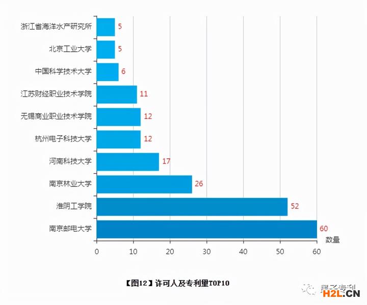 2021年11月全國(guó)高校與科研院所共 257 件專(zhuān)利發(fā)生了 265 次許可備案,其中 10 件專(zhuān)利發(fā)生 10 次獨(dú)占許可備案,240 件專(zhuān)利發(fā)生了 248 次普通許可備案,7 件專(zhuān)利發(fā)生了 7 次排他許可備案,如【圖11】所示;許可人情況如【圖12】,南京郵電大學(xué) 60 件專(zhuān)利發(fā)生許可備案。許可量第一的南京郵電大學(xué)的專(zhuān)利許可備案情況如【表5】所示:
