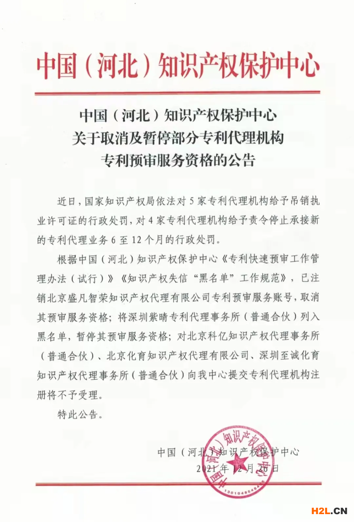 取消北京盛凡智榮知識產(chǎn)權代理有限公司(2021年11月1日更名為北京喆翙知識產(chǎn)權代理有限公司)在我中心專利申請預審服務代理資格;暫停受理深圳紫晴專利代理事務所(普通合伙)、北京科億知識產(chǎn)權代理事務所(普通合伙)、北京化育知識產(chǎn)權代理有限公司、深圳至誠化育知識產(chǎn)權代理事務所(普通合伙)向我中心提交的預審案件,暫停期一年;對上海精晟知識產(chǎn)權代理有限公司、廣東有知貓知識產(chǎn)權代理有限公司、北京艾皮專利代理有限公司、成都正華專利代理事務所(普通合伙)向我中心提交的機構注冊備案將不予受理。