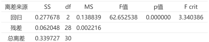 注解:R方表示解釋率,即因變量的68.57%可由自變量來(lái)解釋。DW測(cè)試值應(yīng)該在2.0左右,值為2.0表示樣本中未檢測(cè)到自相關(guān),表示各個(gè)樣本之間是相互獨(dú)立的。從零到2.0的值表示正自相關(guān),而從2.0到4.0的值表示負(fù)自相關(guān)。