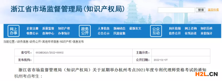 浙江省市場監(jiān)督管理局(知識產(chǎn)權(quán)局)關(guān)于延期舉辦杭州考點2021年度專利代理師資格考試的通知